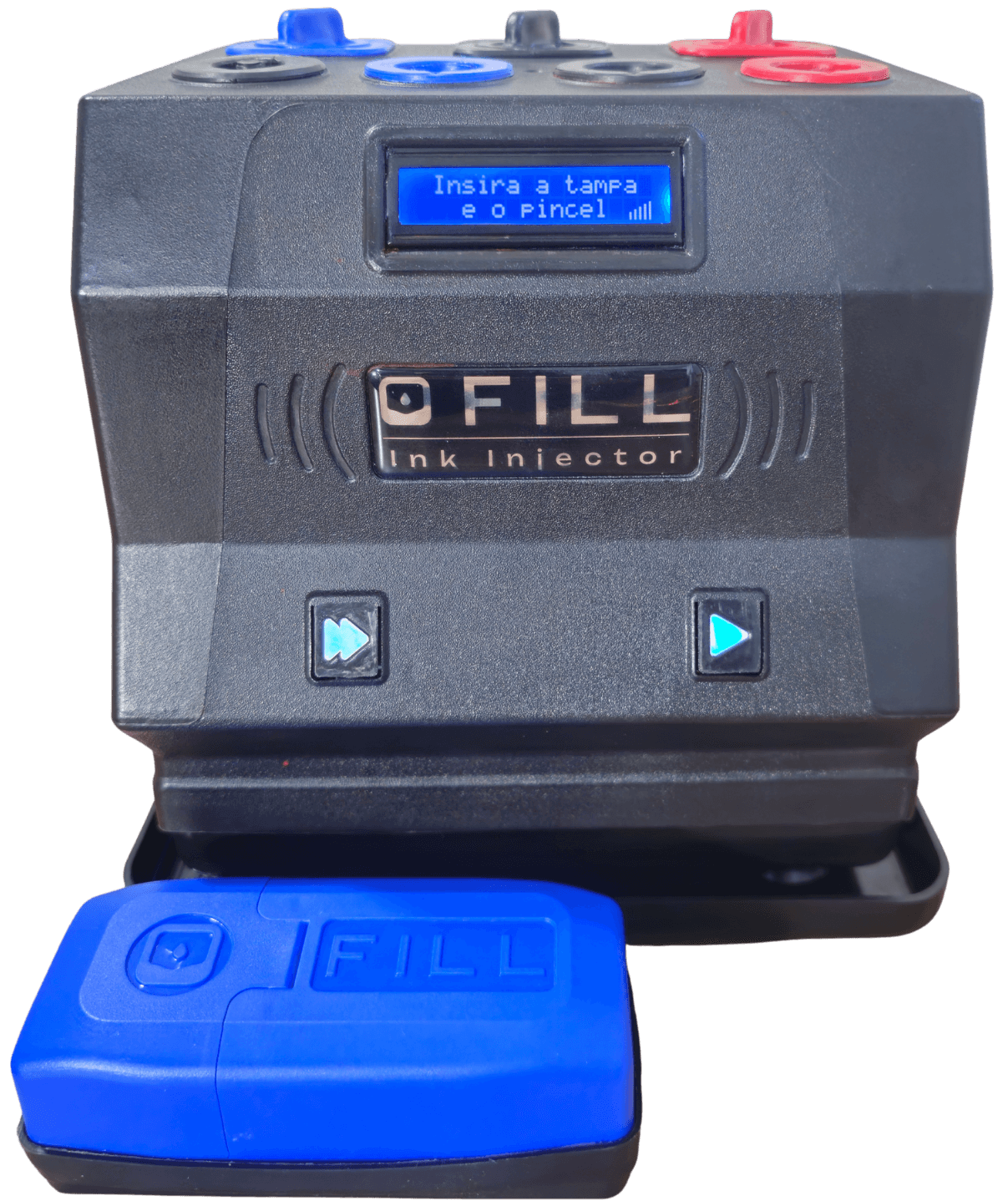A FILL Ink Injector pode carregar na cor azul, preto e vermelho. Fornecemos nossa própria tinta e marcadores (pincéis) nessas cores.